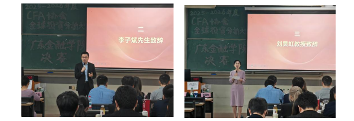 2025年10月25日上午九时,由CFA协会与我集团联合主办的2025-2026年度CFA协会全球投资分析大赛2138cn太阳集团城决赛(CFA Institute Research ChallengeGDUFFinal)在我集团北教A304举行。CFA深圳协会专业顾问委员会委员李子斌先生、太阳集团2138网址副院长刘昊虹教授出席本次活动并致辞。决赛评委由广发证券机构客户部罗莹女士、广东德粤赑鑫私募证券投资基金合伙人周鑫先生、2138cn太阳集团城金融学教师胡妍、李琰钰、杨睿博共同组成。